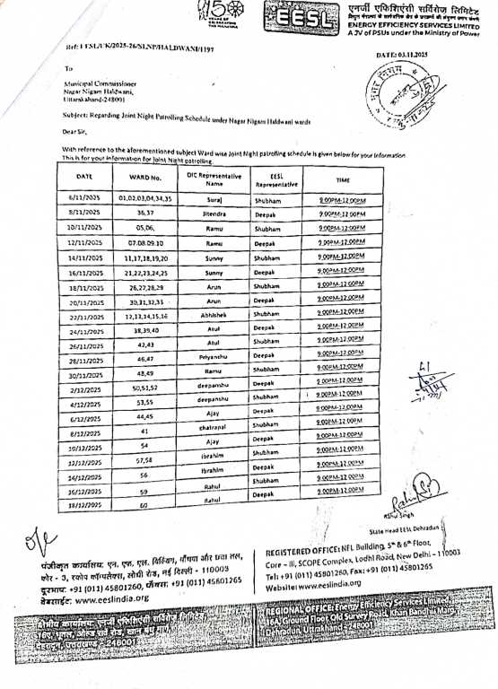 उनके द्वारा 06 नवंबर से 18 नवंबर तक वार्ड नंबर 01 से 60 तक के वार्डों की रात्रि निरीक्षण करने की लिए 02 कार्मिक शुभम सिंह ( मोबाइल नंबर 9695912452) (2) दीपक जोशी (मोबाइल नंबर 7579004207) की तैनाती की गयी है।