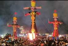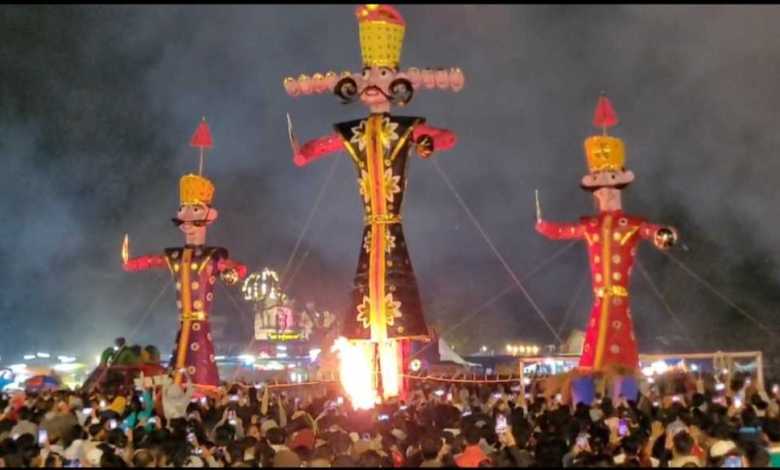 मैदान के बीचों बीच बने 51 फीट ऊंचा अहंकारी रावण, मेघनाथ और कुम्भकरण का पुतला अधर्म पर धर्म की विजय के रूप में दहन किया गया। सुरक्षा के मद्देनजर आमजन को दूर किया गया।