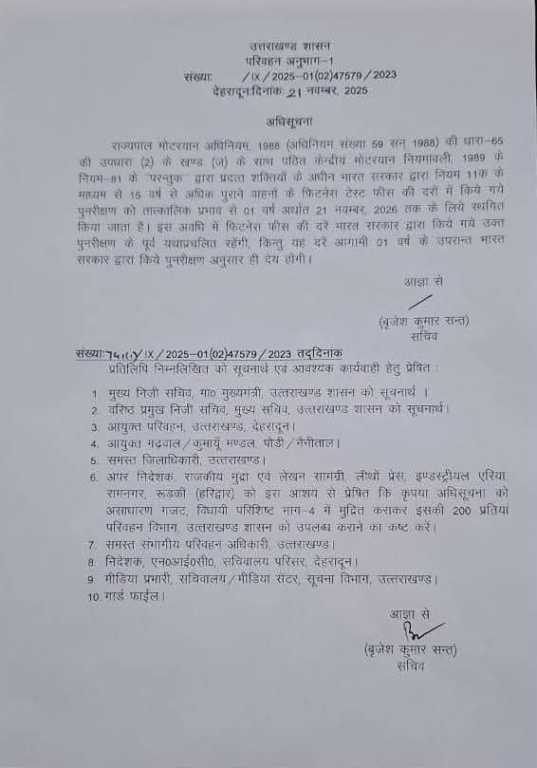 मुख्यमंत्री पुष्कर सिंह धामी के निर्देश पर राज्य सरकार ने उत्तराखंड के वाहन स्वामियों को महत्वपूर्ण राहत प्रदान करते हुए पुराने (15 वर्ष) कमर्शियल वाहनों की फिटनेस फीस में वृद्धि को आगामी 01 जुलाई 2026 तक स्थगित कर दिया है।